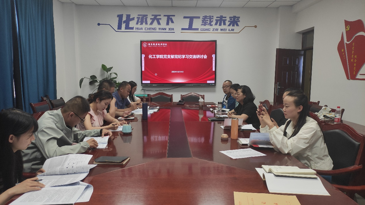 根据党纪学习教育安排,6月4日下午,化工学院党支部在逸夫楼A-213会议室组织开展了党纪学习教育交流研讨会。会议由化工学院党支部书记、院长白锦川主持,全体教师党员参会。