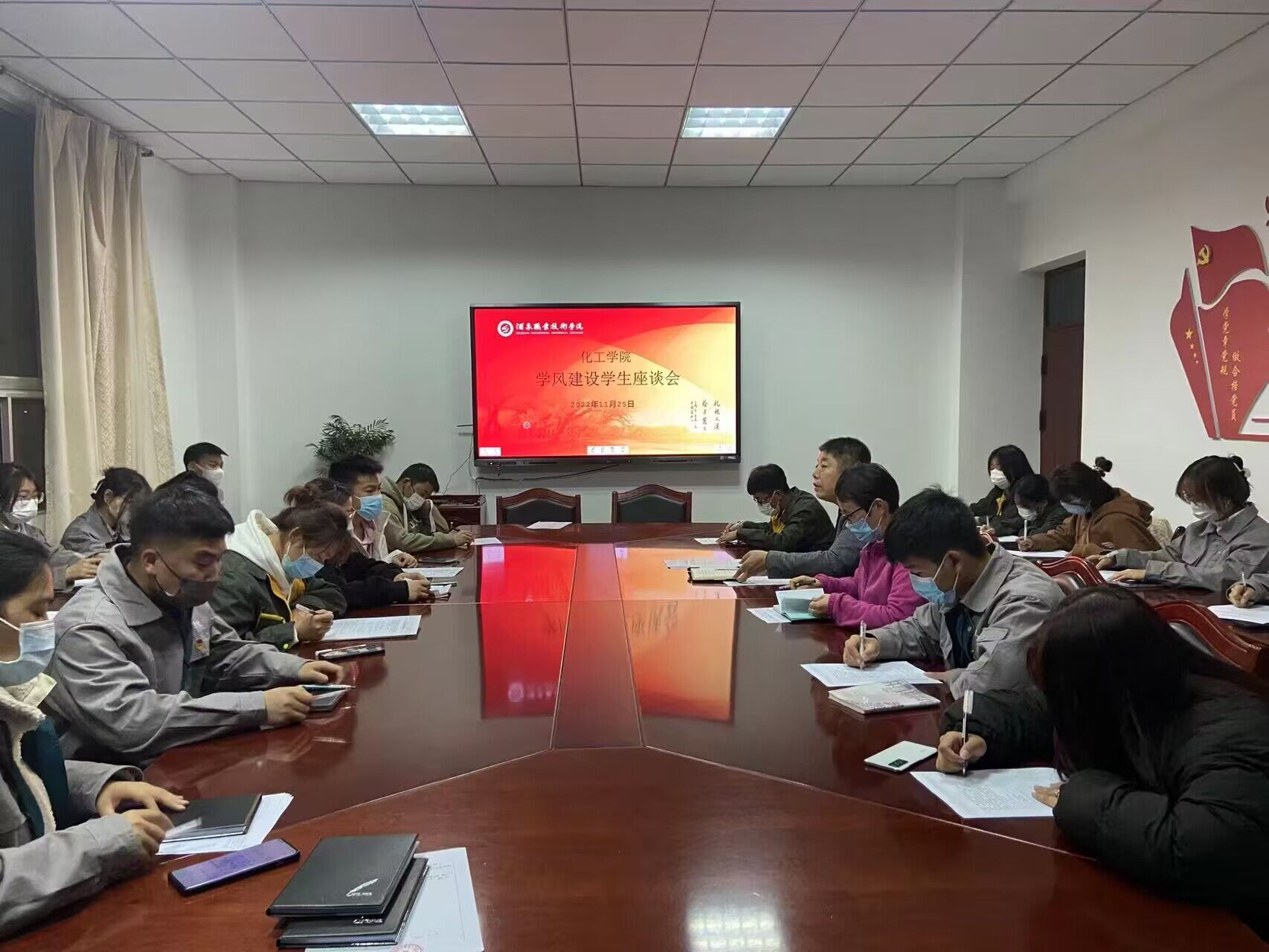 座谈会上,学生代表就本班早操、晨读、课堂使用手机、课堂纪律、自习情况、班级自我管理以及学院开展的学风建设活动效果等方面情况逐一发言交流,并针对当前的疫情防控、课外活动开展等情况进行了讨论,现场填写了包括学风状况满意度、促进优良学风建设方法、学习方面存在问题、学习目的动力等内容的学风调查问卷表。