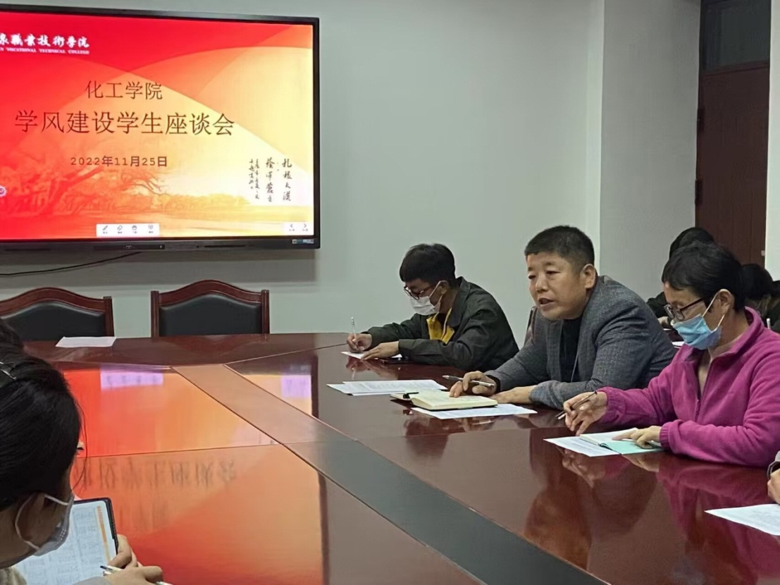 为了深入了解学生的学习生活状况,不断加强学风建设,2022年11月25日,化工学院在逸夫楼二楼会议室召开了学风建设学生座谈会。学生管理办公室主任易建红老师和22名学生代表参加座谈,座谈会由副院长徐军新主持。