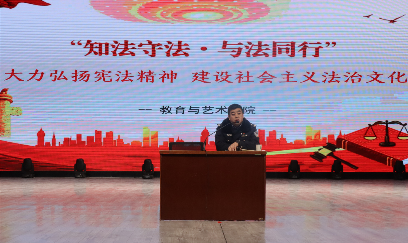 为进一步弘扬宪法精神,切实增强大学生法治意识,营造尊崇宪法、学习宪法、遵守宪法、维护宪法、运用宪法的浓厚氛围,在“12.4”国家宪法日即将来临之际,教育与艺术学院特别邀请酒泉市火车站派出所章指导员为全体师生开展“知法守法、与法同行”——大力弘扬宪法精神,建设社会主义法治文化专题知识教育讲座。