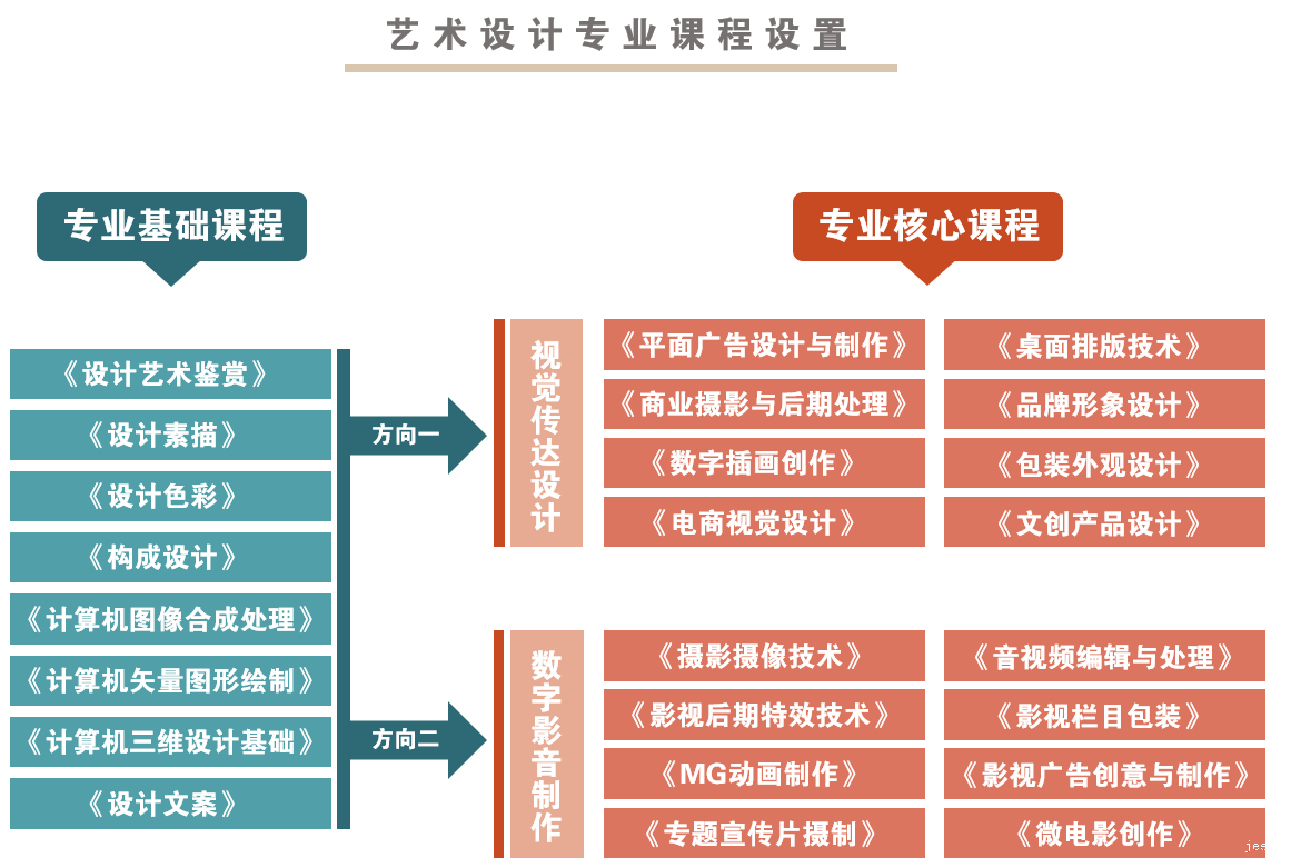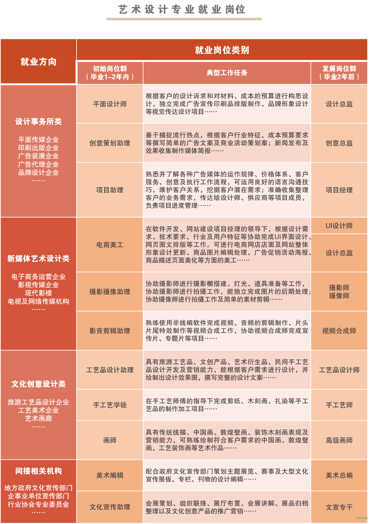 毕业生可在设计事务所类型的设计机构、新媒体艺术设计机构、文化创意产品设计制作机构等各类现代传媒企业或相关政府机构、事业单位从事平面设计、创意策划、摄影摄像、影视后期制作、图文美工、美术编辑、工艺品设计、画师、文化宣传等岗位工作,3-5年逐步升岗职业设计师、设计总监、创意总监、项目经理等岗位,或者学历提升转岗艺术教育、跨专业方向设计岗位(服装设计、工业设计、动漫设计、环境艺术设计等),也可自主创业。