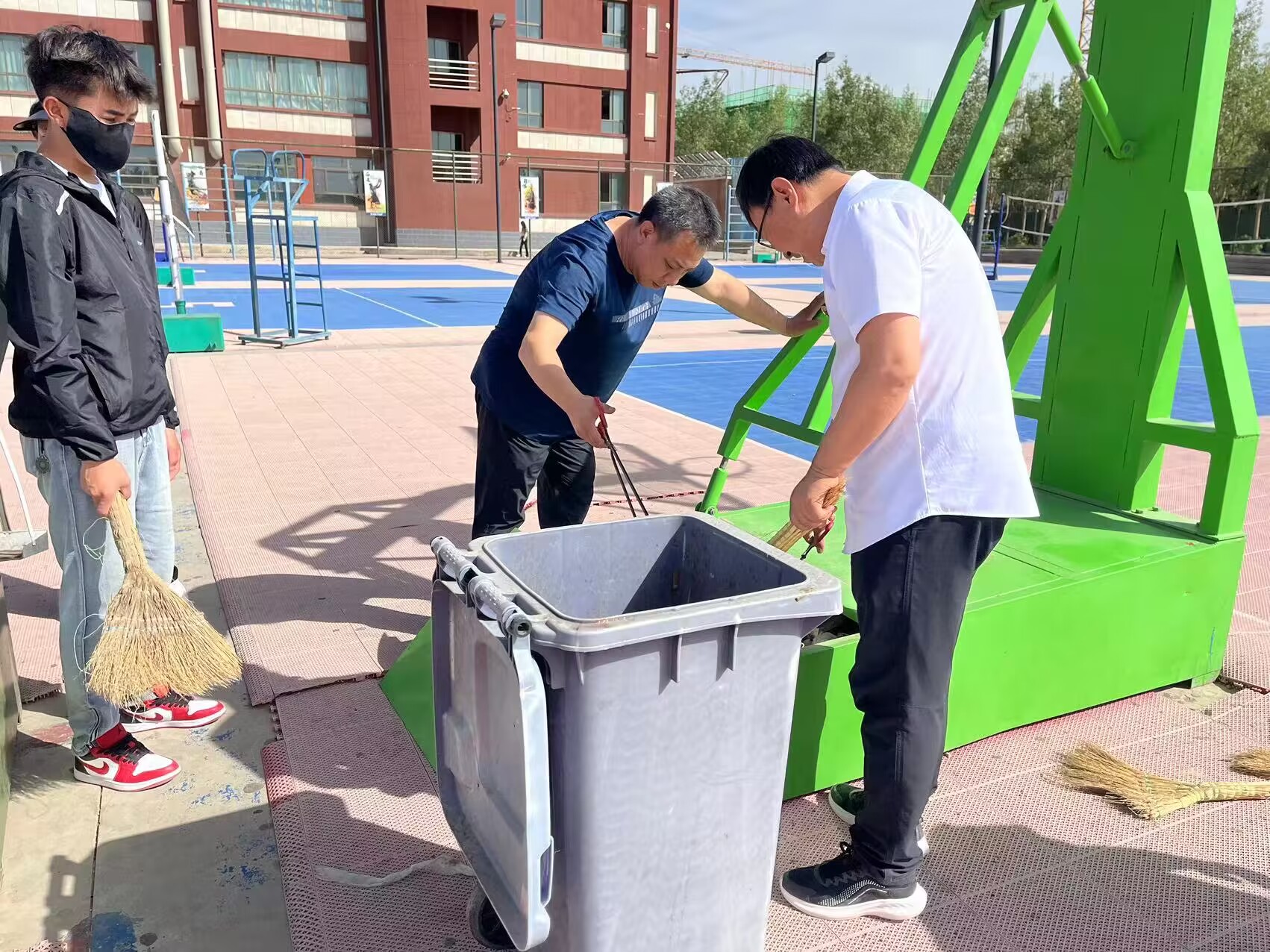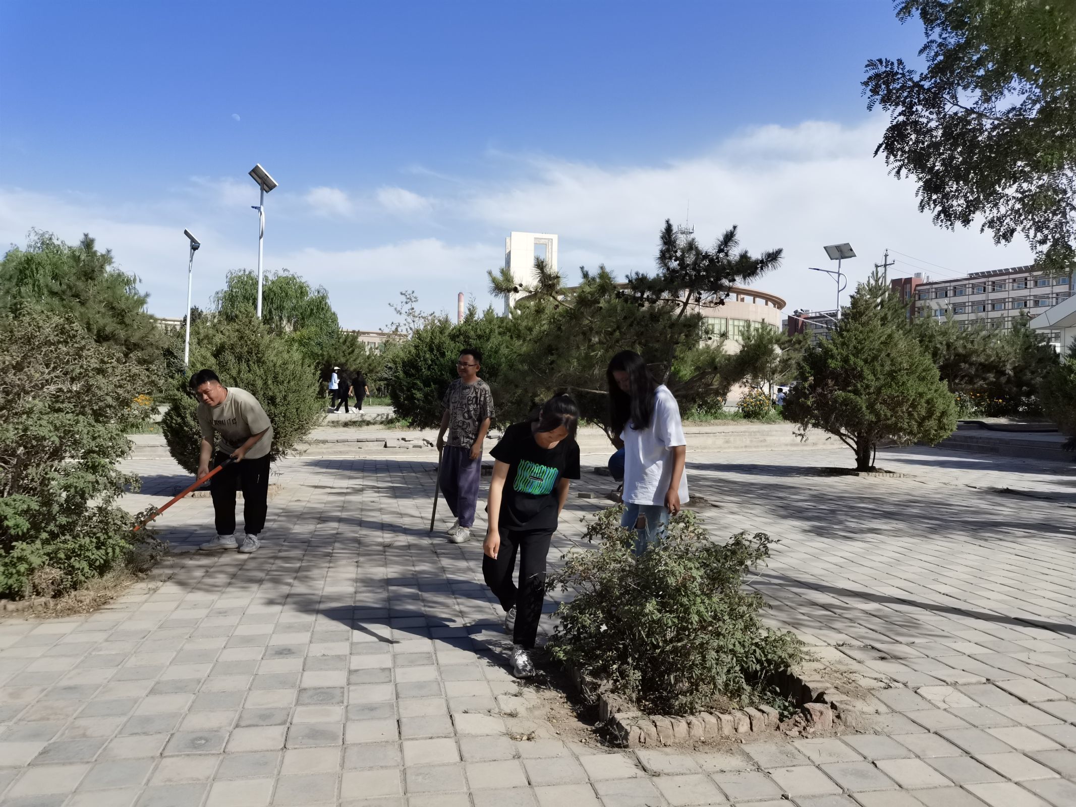 全体人员充分发扬不怕脏、不怕累的优良作风,拿着扫把、夹子等工具,捡拾逸夫楼及操场周边、道路两侧、绿化带等地的碎纸、果皮、塑料袋、烟头等杂物,不放过任何一个死角,极大地改善了卫生状况。