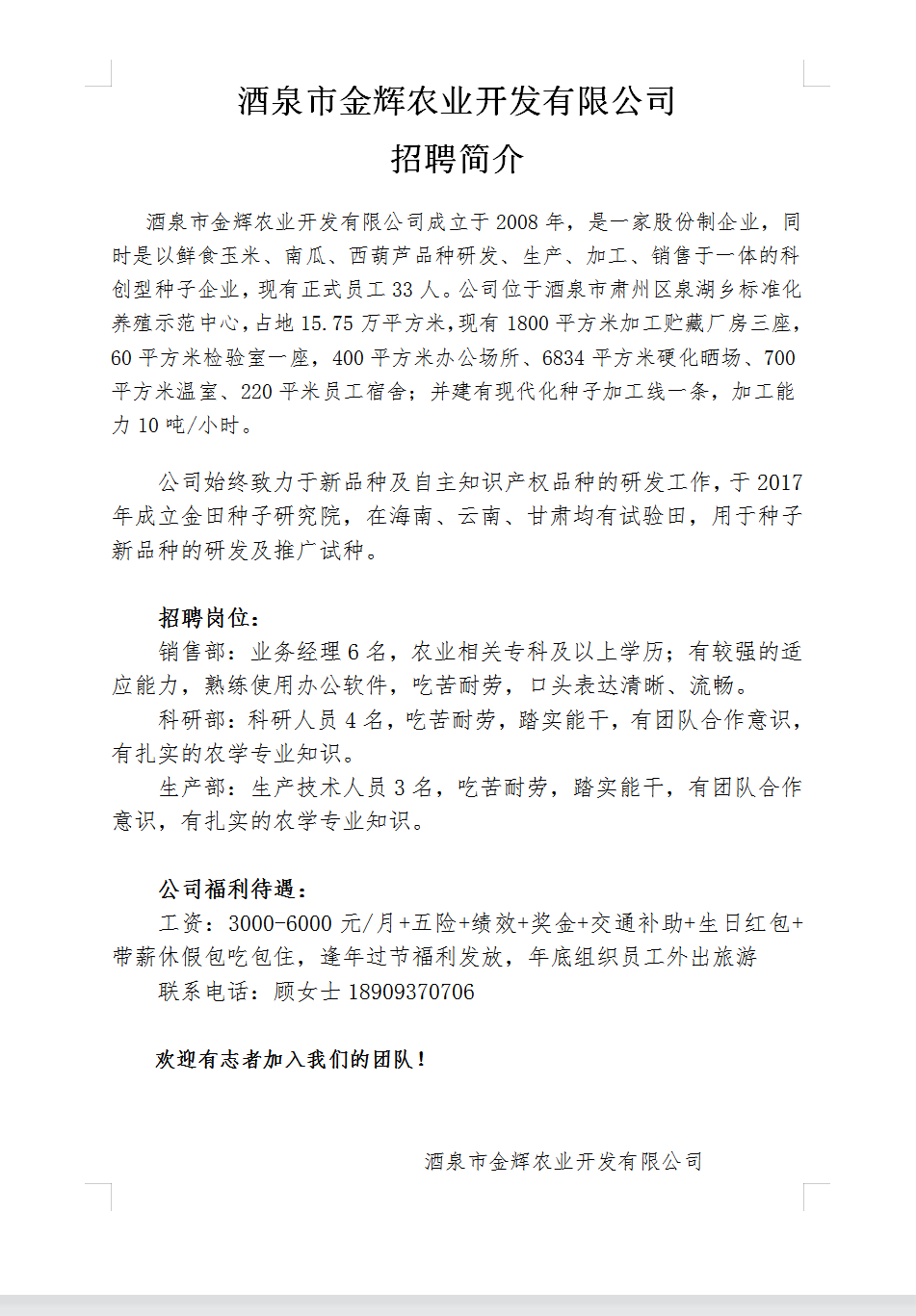 酒泉金辉农业开发有限公司招聘信息