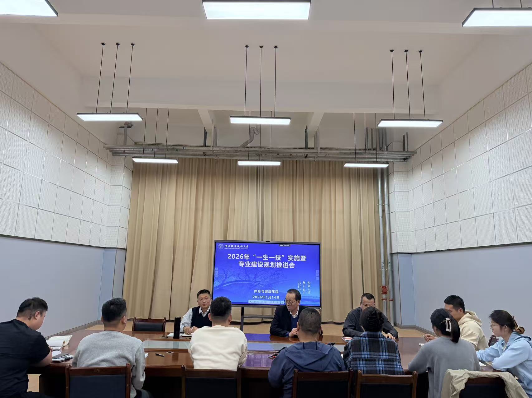 2026年1月14日,体育与健康学院召开“2026年“一生一技”教学工作暨“五金”建设研讨部署会议。会议由学院副院长崔瑾忠主持,学院党支部书记周小刚、党支部副书记、院长马鑫、教研室主任及骨干教师参加。