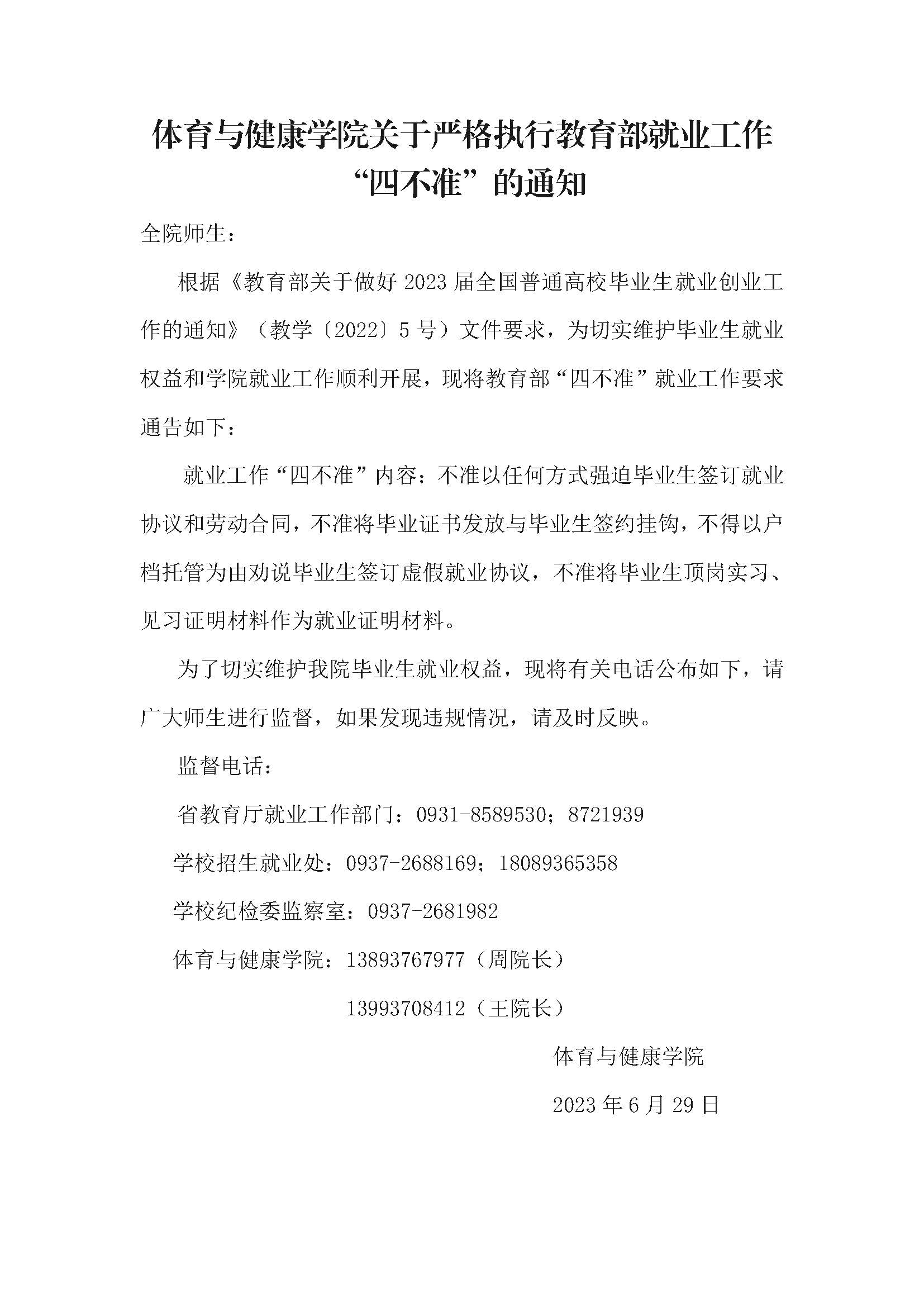 体育与健康学院关于严格执行教育部就业工作“四不准”的通知