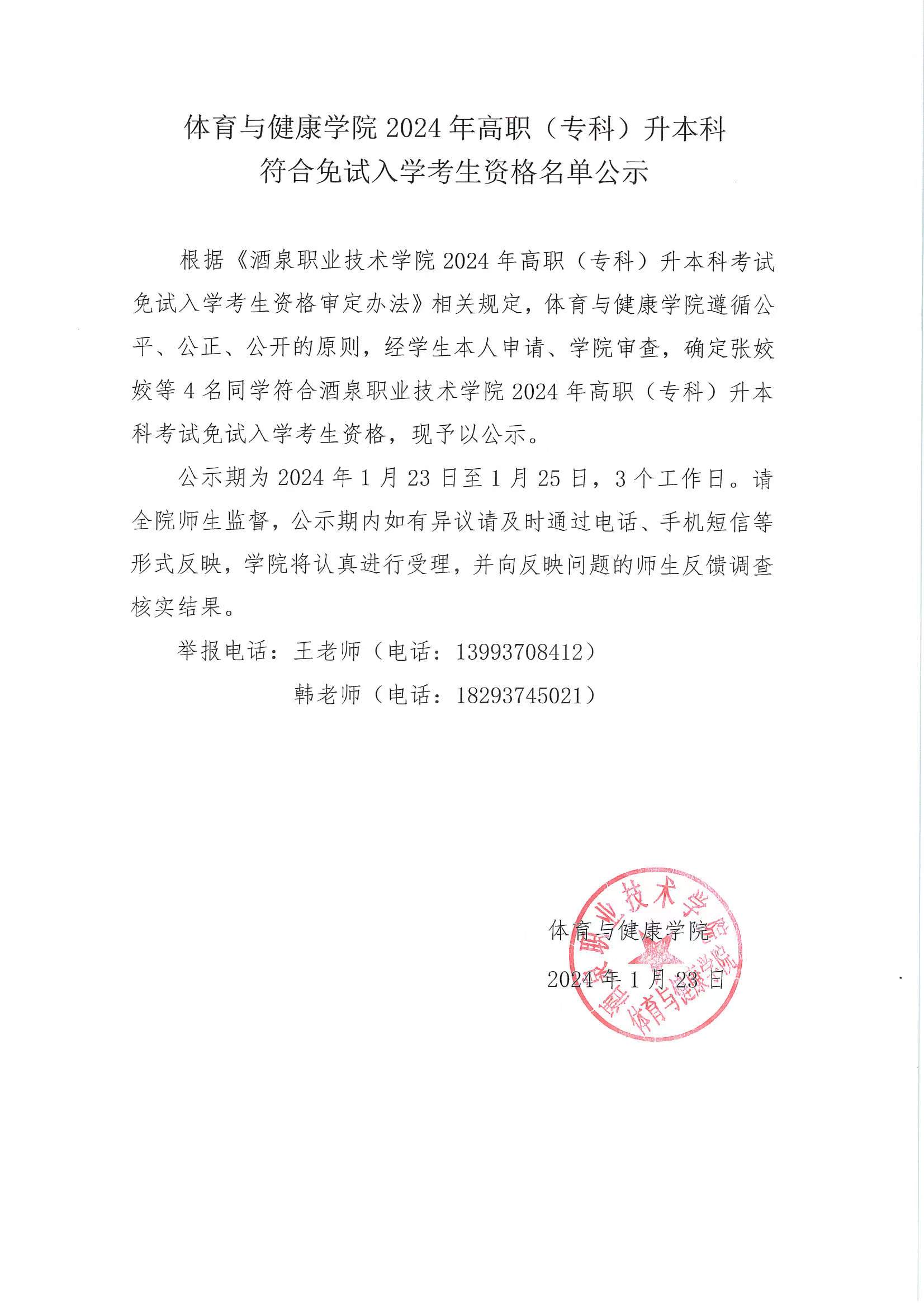 体育与健康学院2024年高职(专科)升本科符合免试入学考生资格名单公示