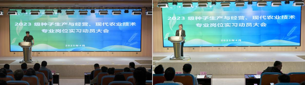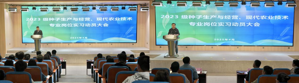 2025年4月30日早上,生物工程学院在弘毅楼C101召开了2023级种子生产与经营、现代农业技术专业岗位实习动员大会。学院领导、实习企业代表、现代农业系全体教师及2023级全体实习学生等共计140余人共同出席了此次会议。会议由生物工程学院党支部副书记李涛主持。