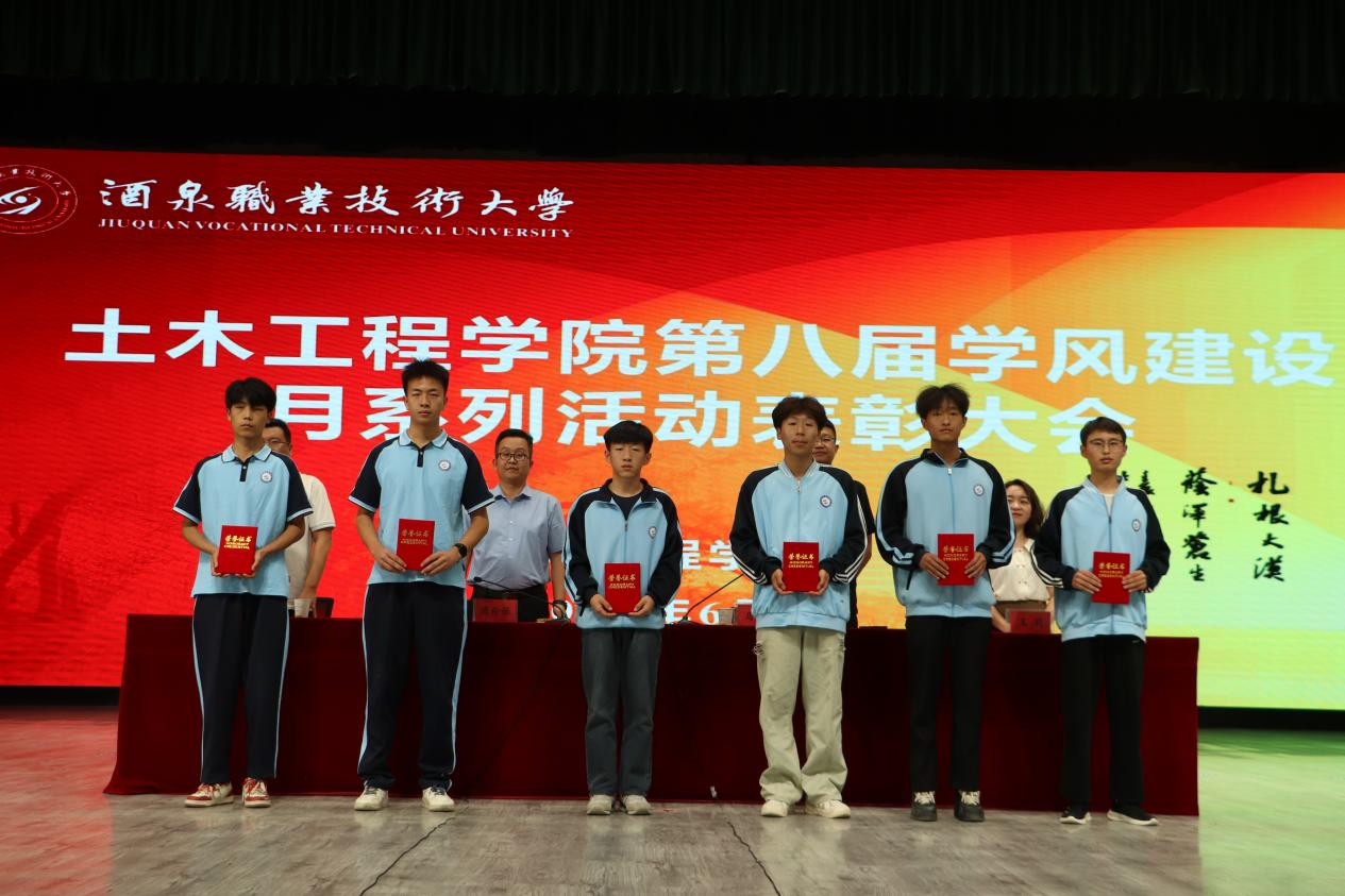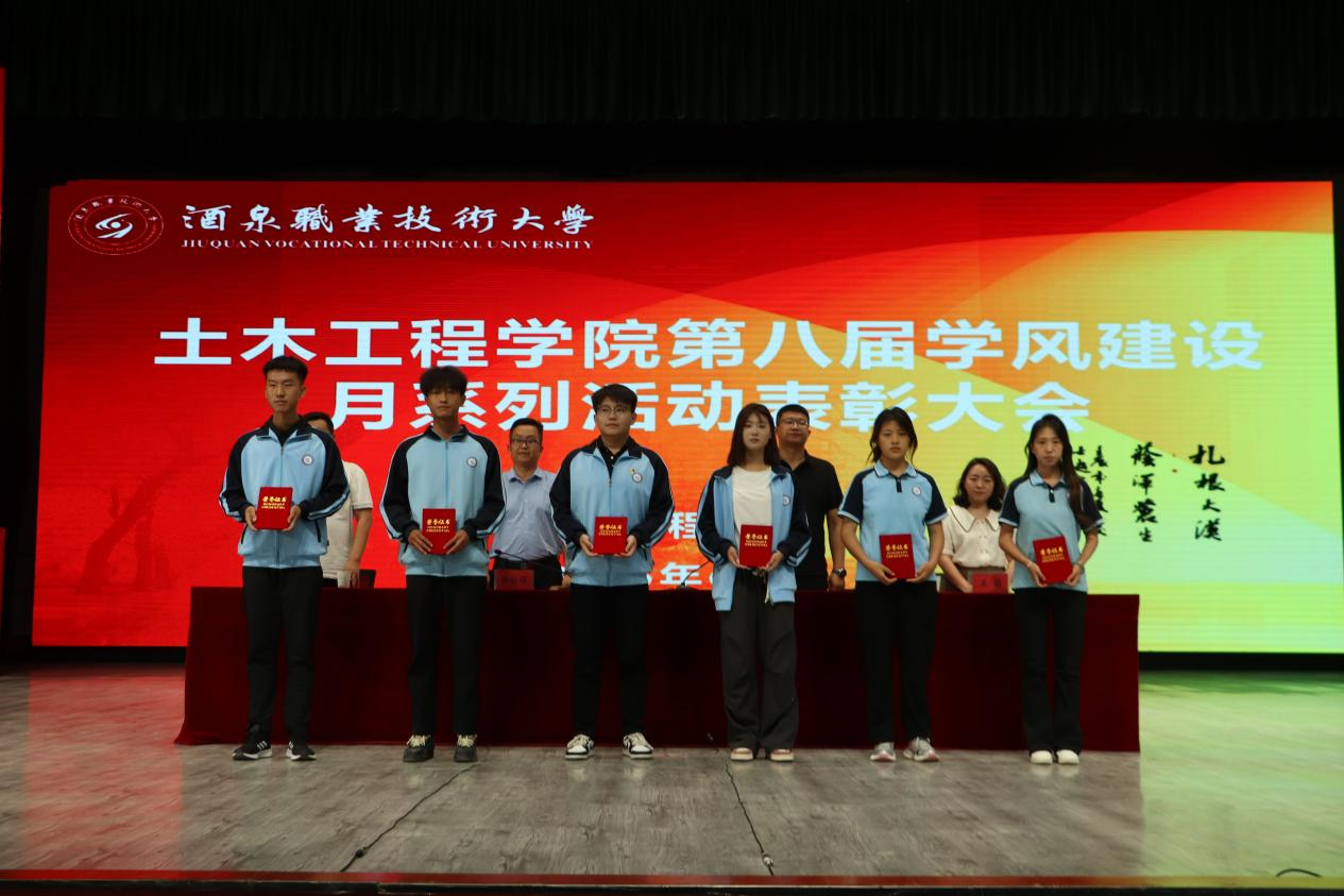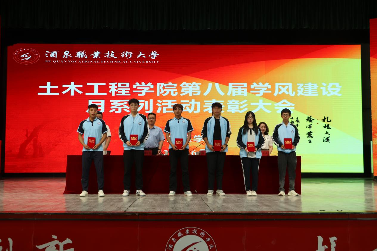 学院副院长马宏宣读《土木工程学院关于“第八届学风建设月”主题活动的表彰决定》文件,并为获奖集体和个人颁发了荣誉证书。同时,为酒泉职业技术大学首届“知行砺能·赋能成长”运动会中表现优秀的学院运动员颁发了荣誉证书。