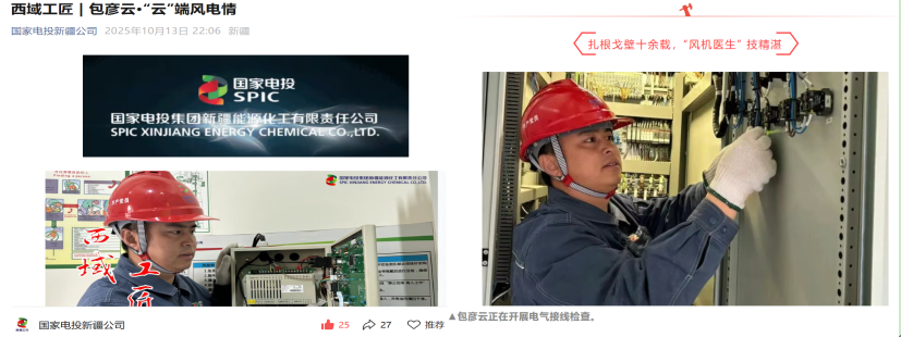 其扎根沙戈荒、奉献绿色能源的事迹曾被国家电投集团能源化工有限责任公司官方微信公众号以“西域工匠”为题进行报道,展现了新时代高职毕业生投身国家能源战略、在平凡岗位上创造价值的青春形象。