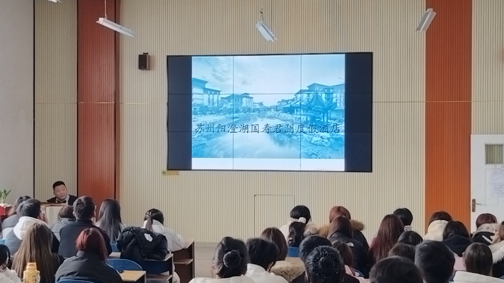 洽谈会后,专场招聘会正式启动,学院2026届百余名准毕业生踊跃参与。宣讲环节中,陈总与周总结合企业宣传片,全方位展示了酒店的发展历程、企业文化、核心业务板块及未来战略规划。作为苏州市内极具影响力的高端度假酒店,企业近年来发展势头强劲,人才需求持续攀升。本次招聘开放前厅接待、客房管理、市场营销、餐饮服务、烹饪技艺等多个优质岗位,并详细介绍了完善的薪酬福利体系、清晰的职业晋升路径及系统化的员工培训计划,为毕业生搭建起广阔的职业发展平台。