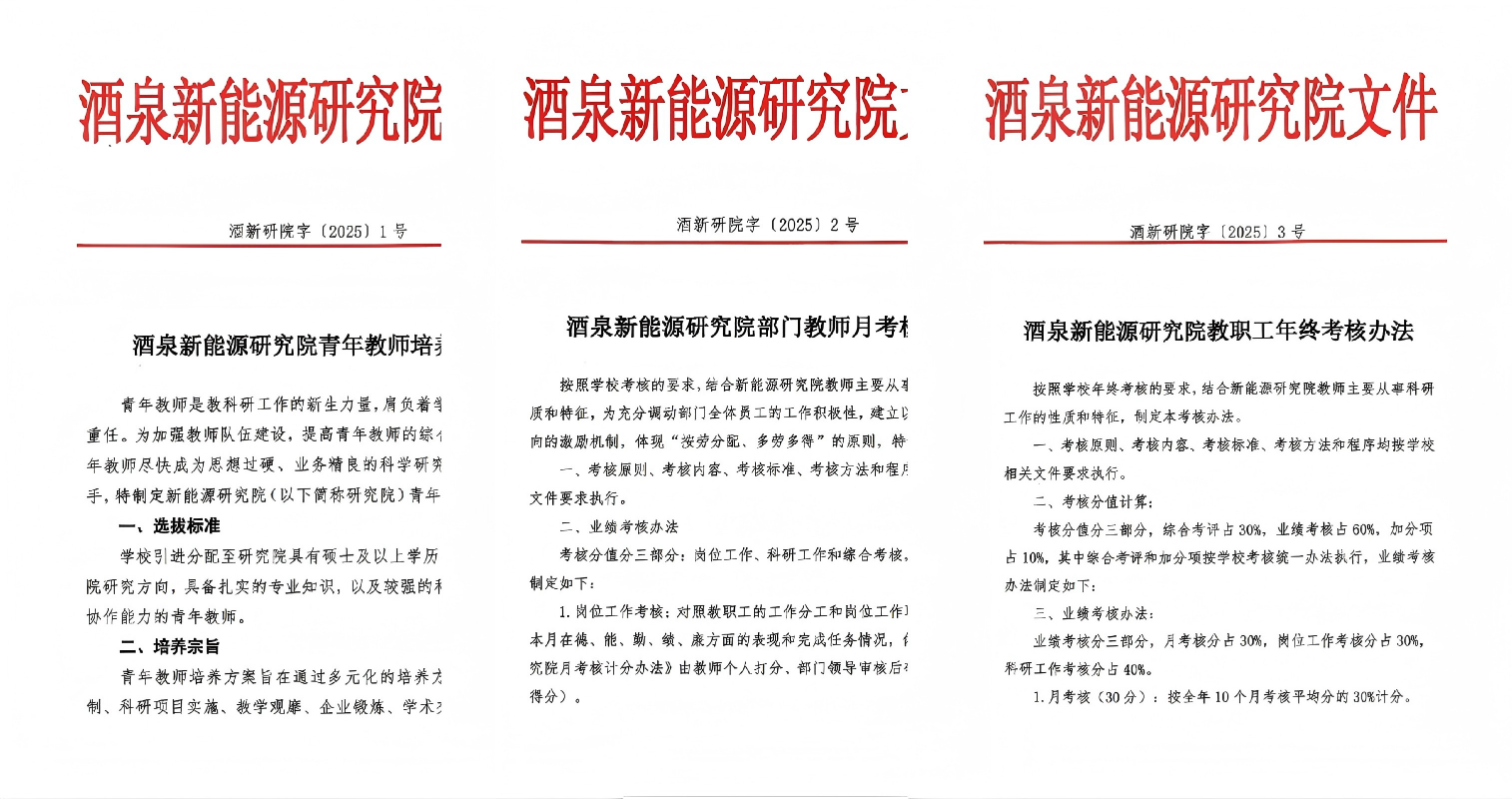 以制度建设为引领,激发创新活力,增强发展动力。制定《新能源研究院青年教师培养方案》、《新能源研究院科技创新团队建设方案》、《新能源研究院绩效考核办法》,修订了《新能源研究院教师月考核计分办法》等制度,首次将绩效考核应用于日常管理,通过制度建设明确了各岗位职责与工作流程,为科技创新团队的建设提供了制度保障,充分调动了教师的工作积极性和创造性,形成了以制度管人、按流程办事的良好工作格局,有效提升了管理效能。