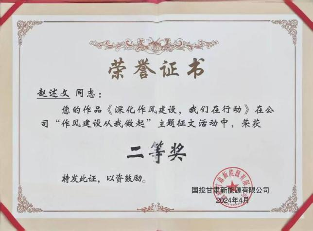 工作期间,他始终秉持“扎根大漠、荫泽苍生”的胡杨精神,铭记母校“修身笃学、精艺尚能”的校训,持续精进自我,工作期间,荣获公司“作风建设从我做起”主题征文比赛二等奖、公司“奋进杯”技能竞赛三等奖等多项荣誉。