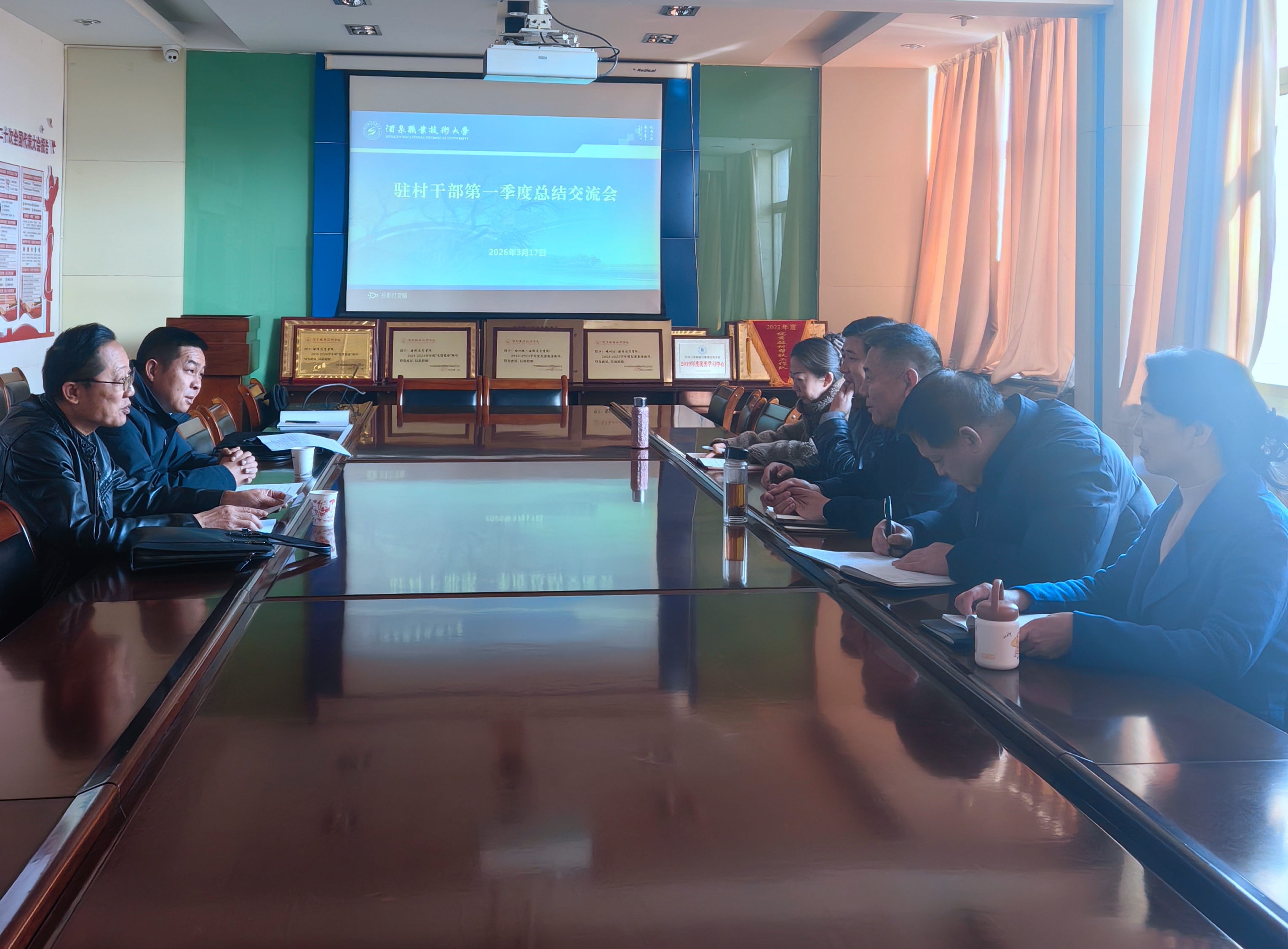 2026年3月17日,酒泉职业技术大学乡村振兴学院组织召开驻村干部2026年第一季度工作总结交流会,继续教育学院领导班子成员、乡村振兴学院全体人员及派驻丁家闸村、小坝沟村的驻村干部参加了会议。会上,总结了2025年帮扶工作成效,谋划了下阶段工作思路,凝聚了乡村振兴帮扶合力。会议由继续教育党支部书记王瑜珲主持。