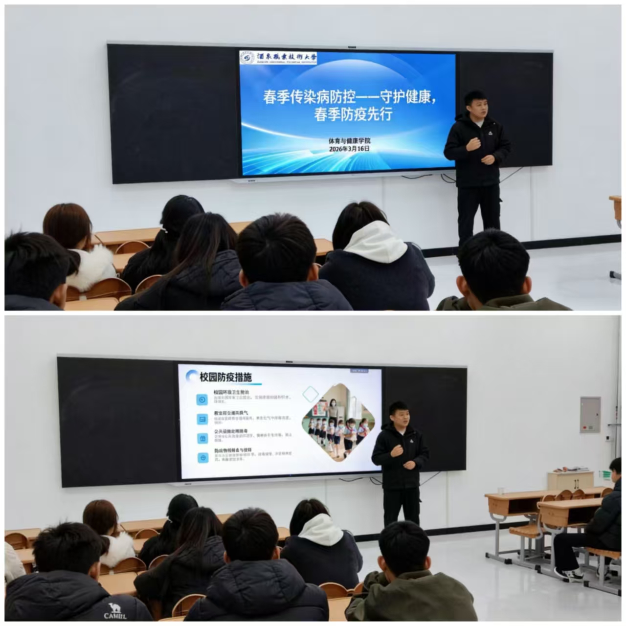 为筑牢校园防疫防线,守护学生身心健康,3月16日,体育与健康学院组织各班级召开“春季传染病防控——守护健康,春季防疫先行”主题班会。