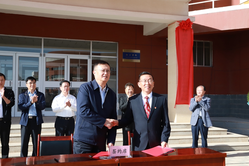启动仪式结束后,酒泉职业技术学院举行甘肃省化工研究院酒泉分院校企合作签约暨揭牌仪式。学校党委书记、校长易志军与省化工研究院有限责任公司董事长梁锐共同签署战略合作协议;省科学技术厅副厅长巨有谦与市政协党组副书记、市政府党组成员、酒泉经开区党工委书记任晓敏共同揭牌。学校党委委员、副校长王立智主持揭牌仪式。