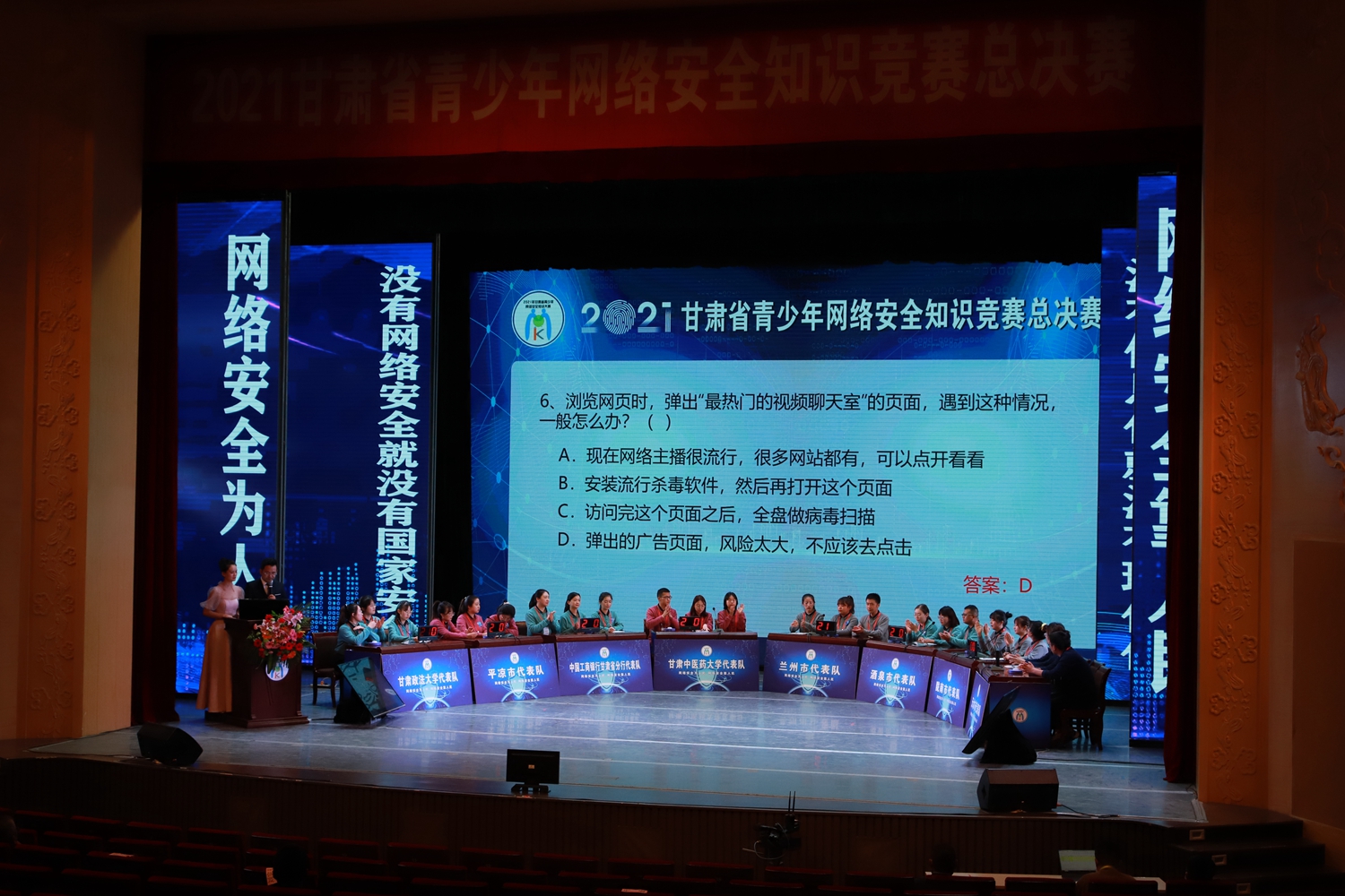 要闻快递 > 正文为深入宣传贯彻习近平总书记关于网络强国的重要思想,激发全省广大青少年学习网络安全知识的积极性,提升广大青少年网络安全意识和基本防护技能。10月9日,由中共甘肃省委网信办、甘肃省教育厅、甘肃省公安厅、共青团甘肃省委、中国人民银行兰州中心支行主办,酒泉职业技术学院、国网甘肃省电力公司承办的2021年甘肃省青少年网络安全知识竞赛总决赛在敦煌市飞天剧院成功举办。省委网信办副主任刘宗礼、省委网信办网络管理执法处处长冯乐泉、省电化教育中心主任包磊、省公安厅网络安全保卫总队一级调研员张生顺、共青团省委宣传部副部长徐杰、酒泉职业技术学院党委副书记许军、中国人民银行兰州中心支行科技处副调研员童深以及国网甘肃省电力公司电科院副院长马志程等领导出席活动。