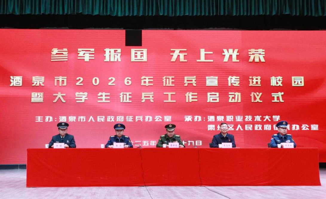 要闻快递 > 正文2025年12月19日下午,酒泉市2026年征兵宣传进校园暨大学生征兵工作启动仪式在酒泉职业技术大学胡杨活动中心举行。本次活动由酒泉市人民政府征兵办公室主办,酒泉职业技术大学、肃州区人民政府征兵办公室共同承办,旨在深入贯彻习近平强军思想,进一步激发广大青年学子投身国防、报效祖国的热情,为新时代国防和军队现代化建设输送高素质兵员。